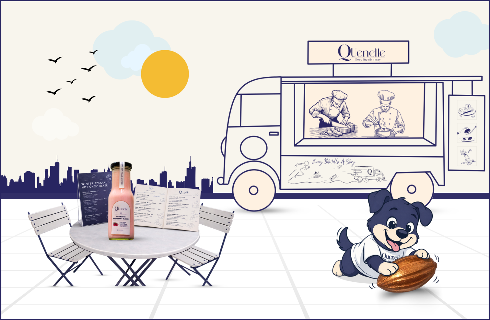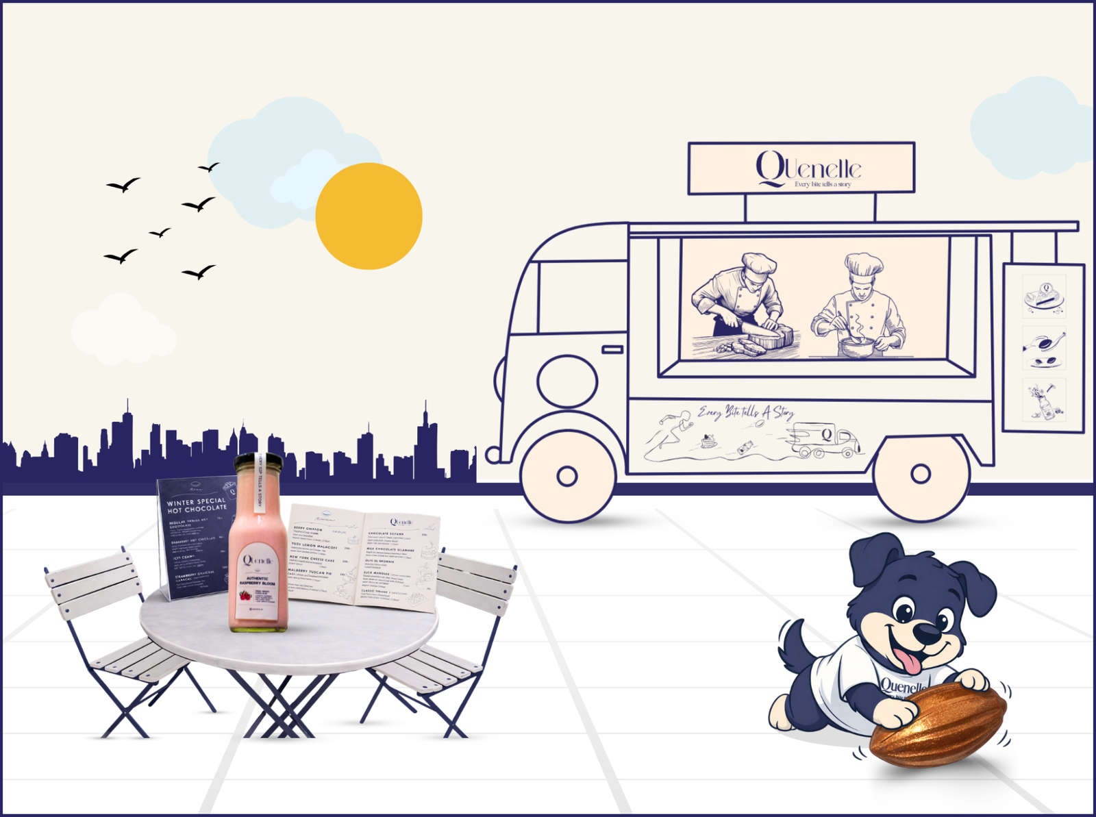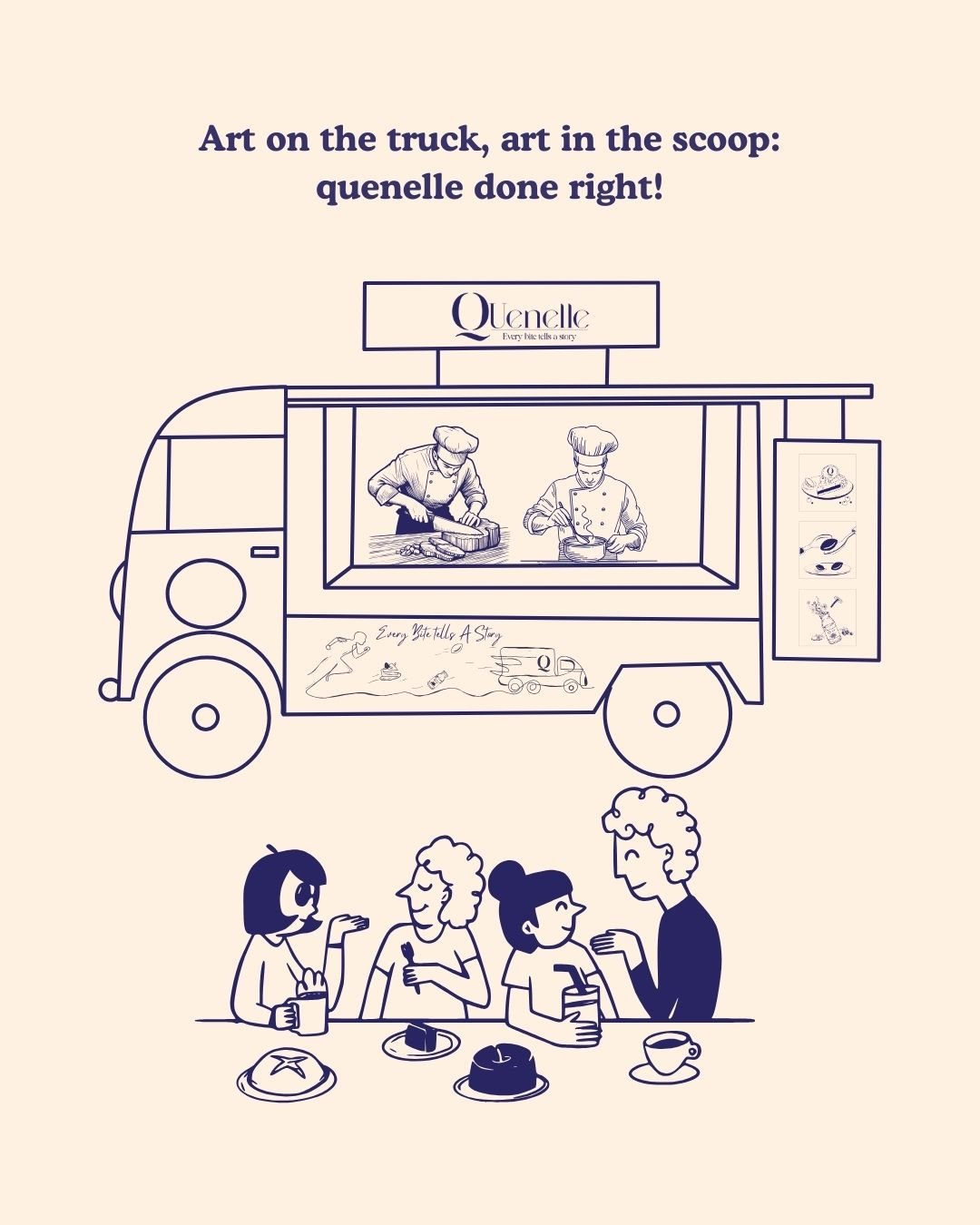 Quenelle is a brand we helped shape with thoughtful and playful design elements that bring its personality to life. From crafting elegant menus that beautifully present their desserts, to creating an adorable dog mascot that adds charm and character to the brand, every detail was designed to feel warm and inviting. We also designed the Quenelle truck, turning it into a visually delightful extension of the brand that instantly catches attention. Together, these elements create a cohesive, memorable experience that feels just as delightful as the desserts Quenelle serves.