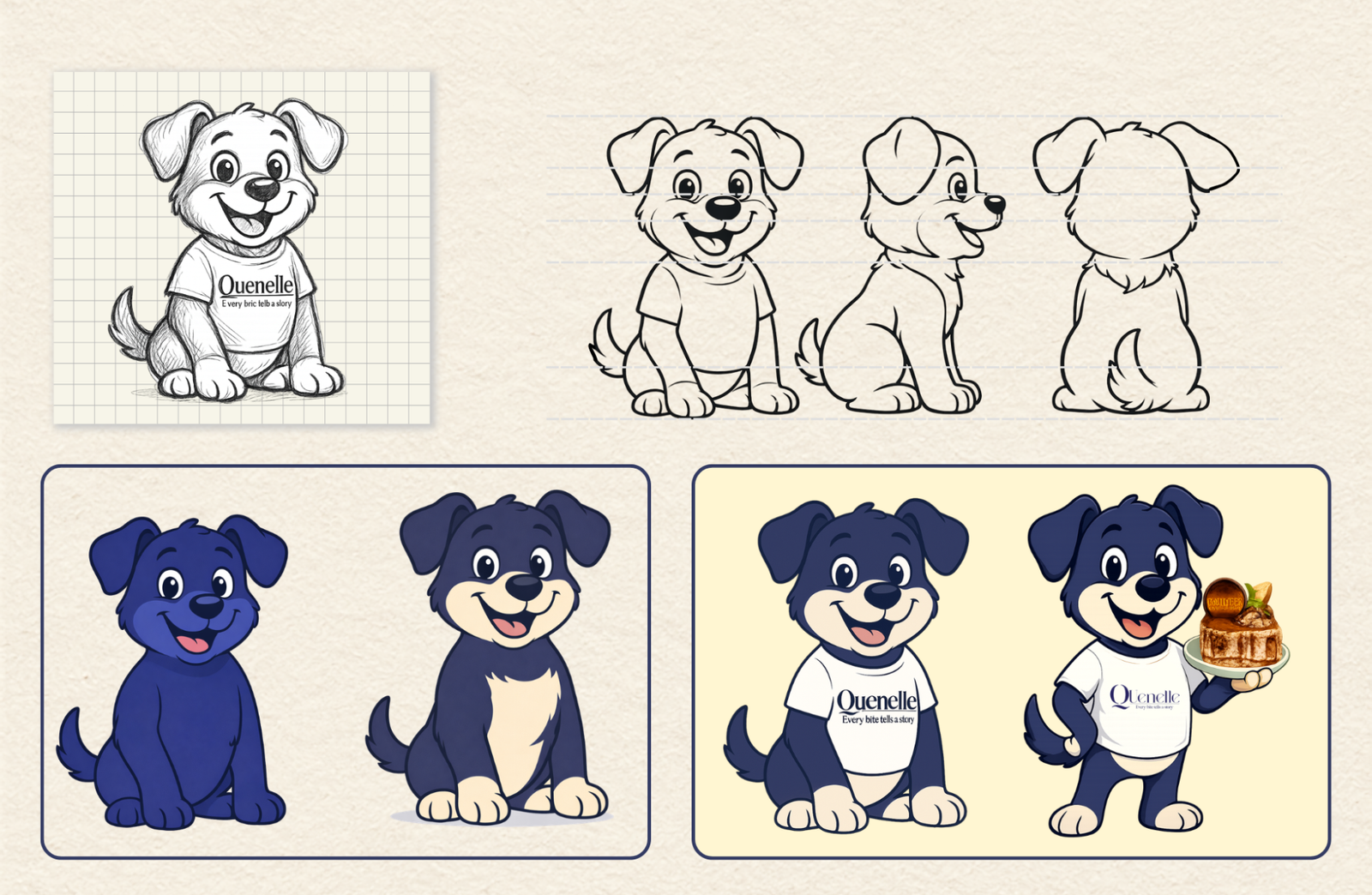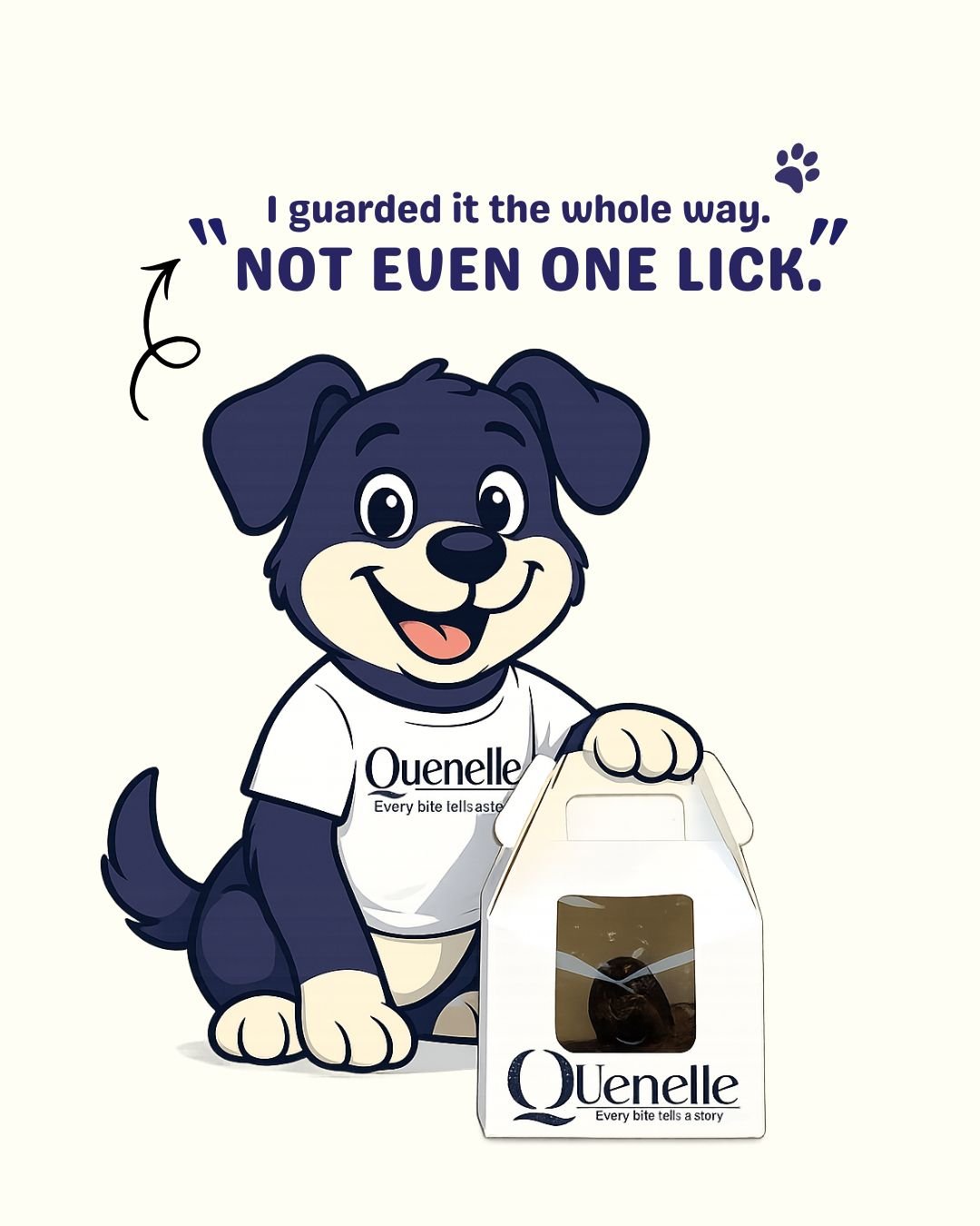 To add a playful and memorable element to Quenelle’s brand communication, we created a custom dog mascot that reflects warmth, charm, and a love for desserts. The character was designed to feel friendly and relatable, helping the brand connect with its audience in a light-hearted way across social media. To strengthen the brand association, the mascot was also illustrated wearing a Quenelle T-shirt, subtly reinforcing the identity while making the character instantly recognisable. This mascot adds personality to the brand and creates opportunities for engaging, story-driven content.